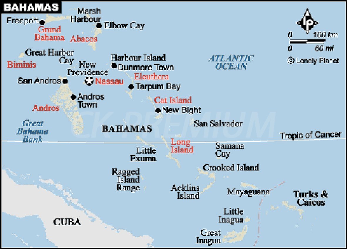 Tento ostrovní stát leží jihovýchodně od Floridy a severozápadně od Kuby. Souostroví tvoří 30 větších, 700 menších a zhruba 2400 korálových ostrovů. Toto souostroví vytváří oblouk, který zaujímá plochu moře zhruba 260 000 km2. Ostrovy jsou tvořené z korálů a vápence. Největší ostrov je Andros (6000 km2). Na ostrovech nejsou žádné řeky. Hospodářství je velmi silně ovlivněno cestovním ruchem. Nejčastějšími návštěvníky jsou Američané a Kanaďané. Celková návštěvnost těchto ostrovů dosahuje více než 6 mil. osob. Cestovní ruch se soustřeďuje především na ostrov New Providence, postupně se rozšiřuje i na další ostrovy.